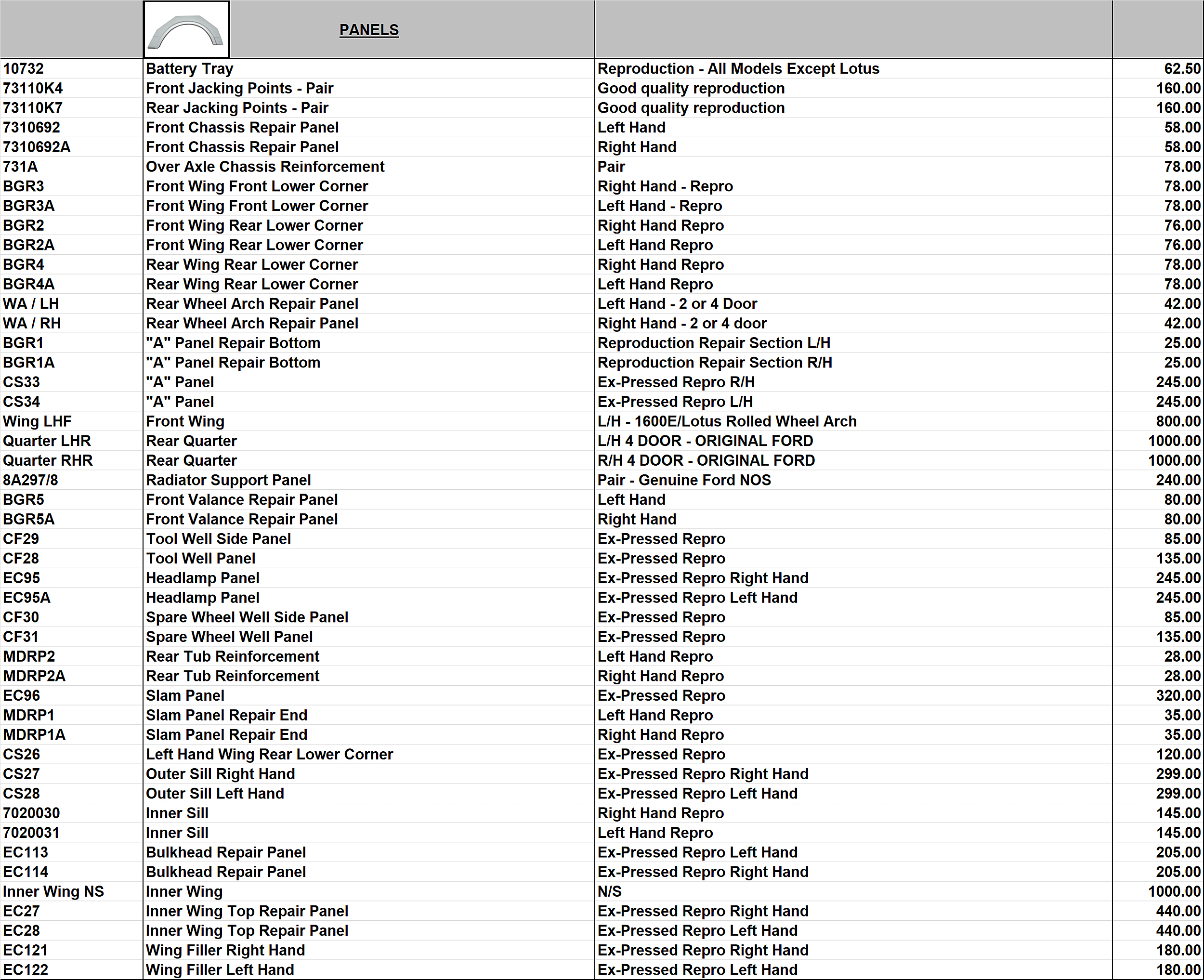 POA – Price on Application NLA – No Longer Available