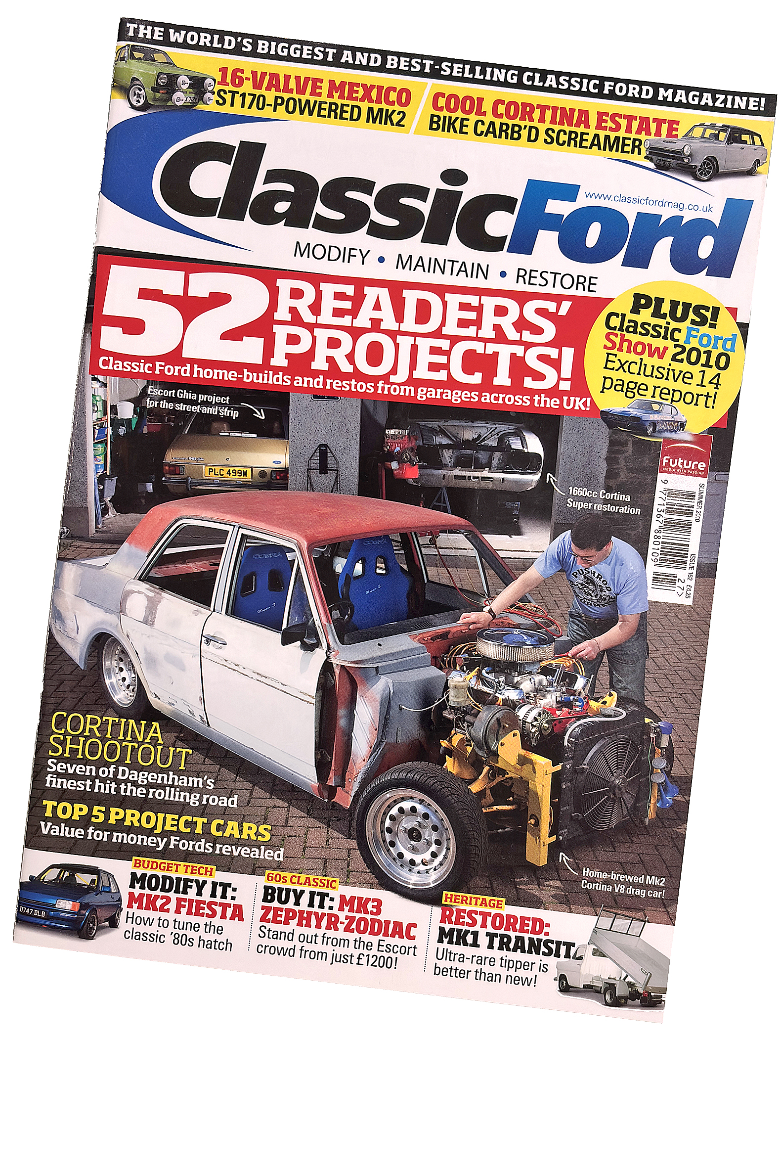 At the start of 2010 Thierry wrote in to Classic Ford Magazine about his amazing project in the hope it might be included in their regular “Grafters” feature. Editor Simon Woolley wasted no time in heading over to Thierry’s home in Wales for a professional photoshoot – but not for the Grafters column Thierry had contacted the magazine about. Simon was so taken with the V8 Cortina that it was to get its own full five page feature article and put the car on the front cover of the magazine too!