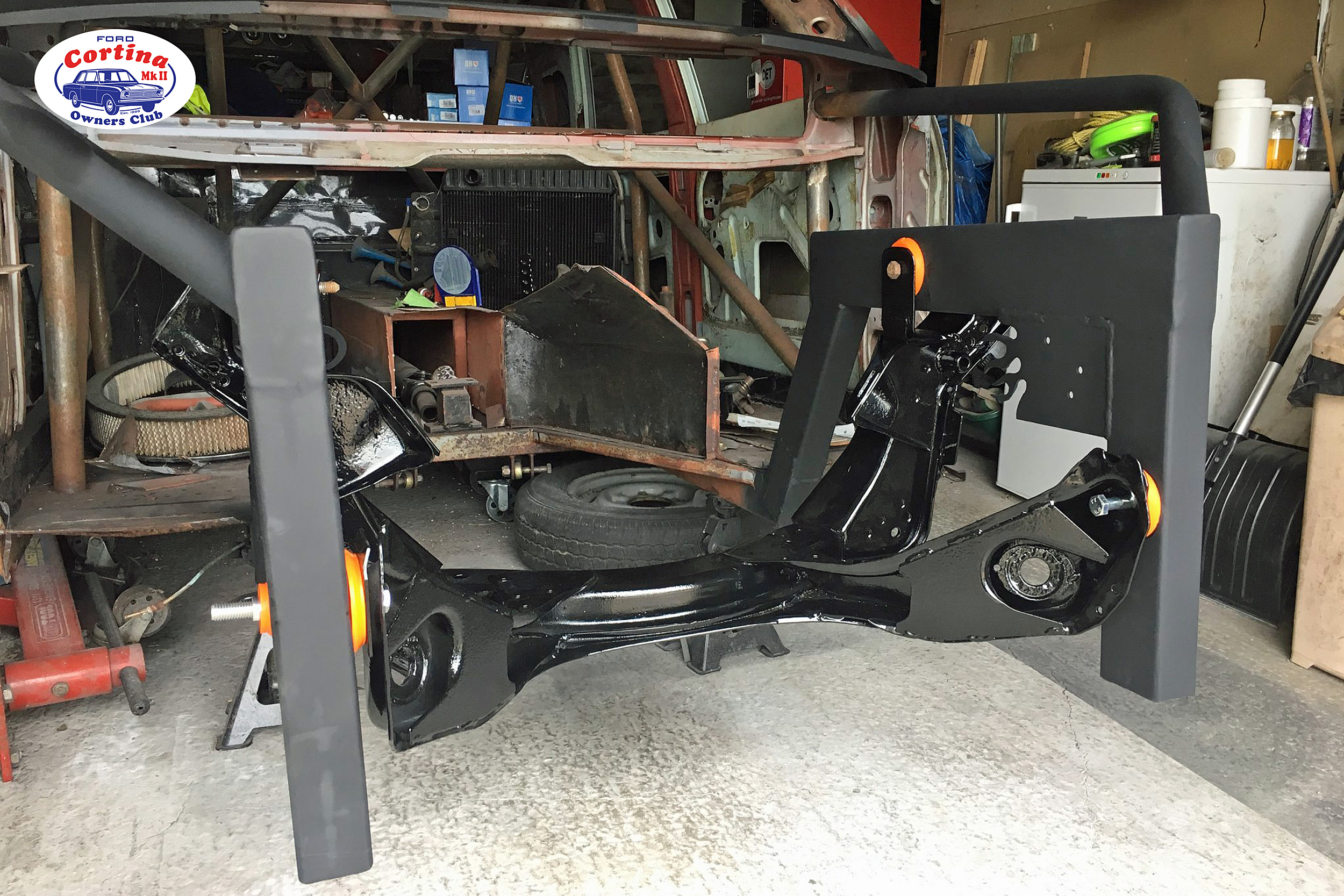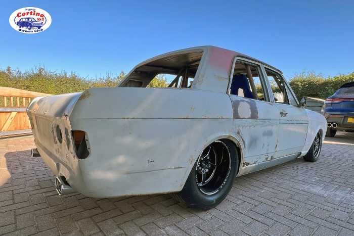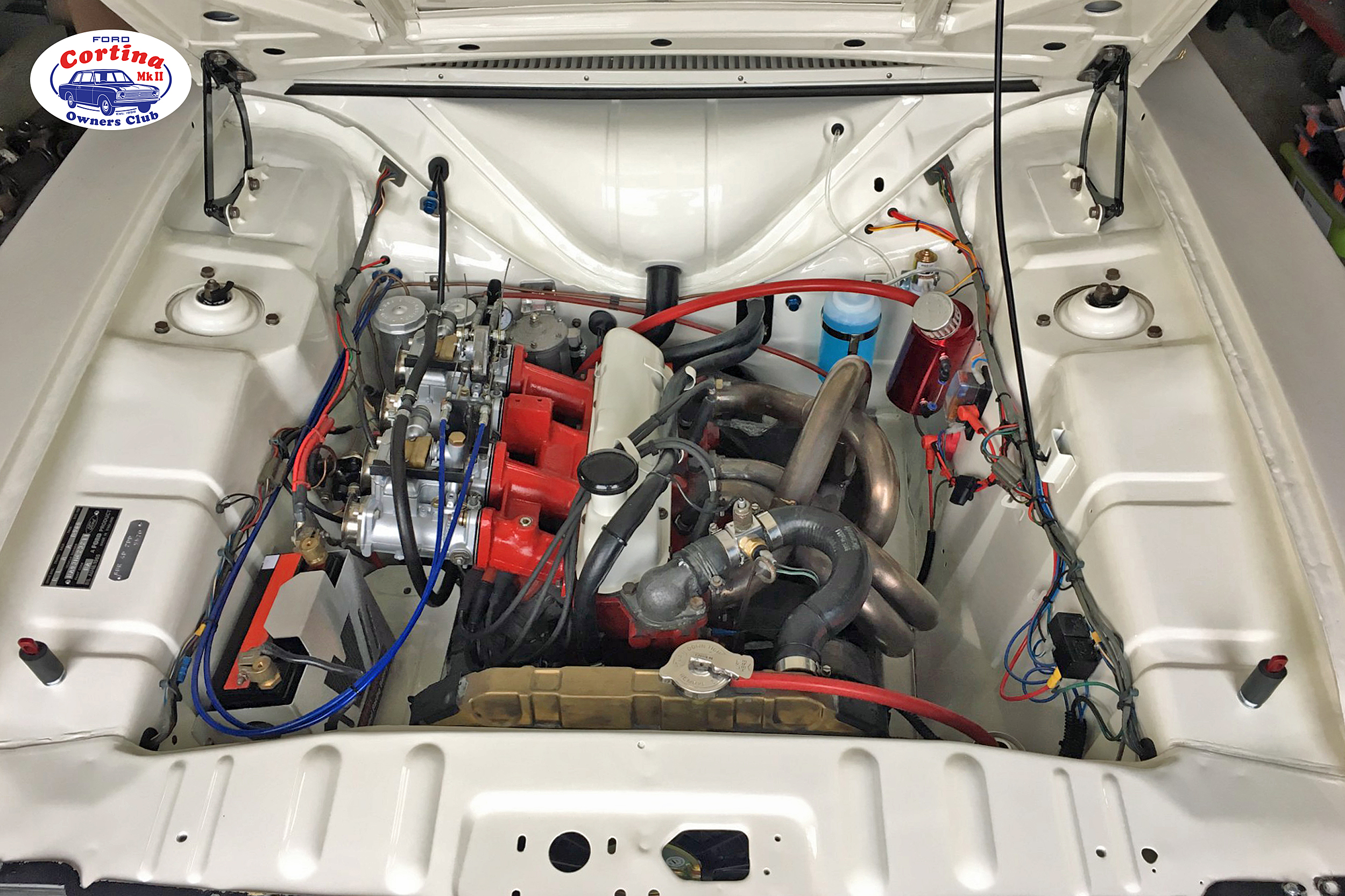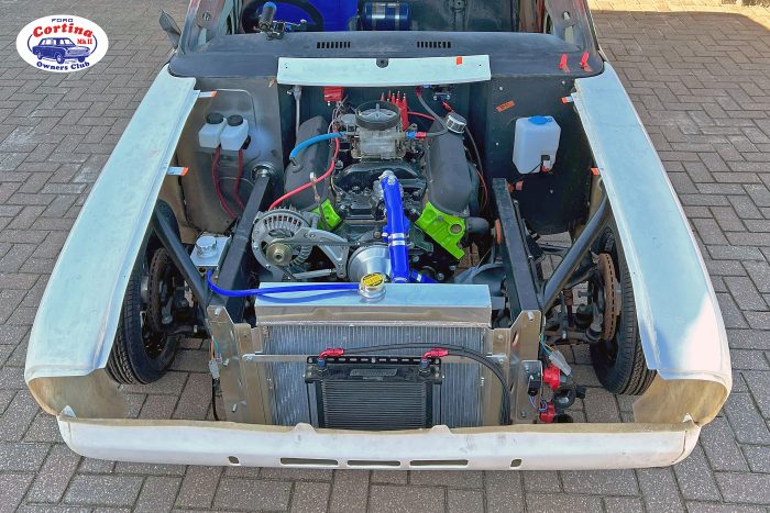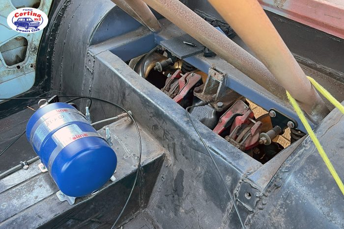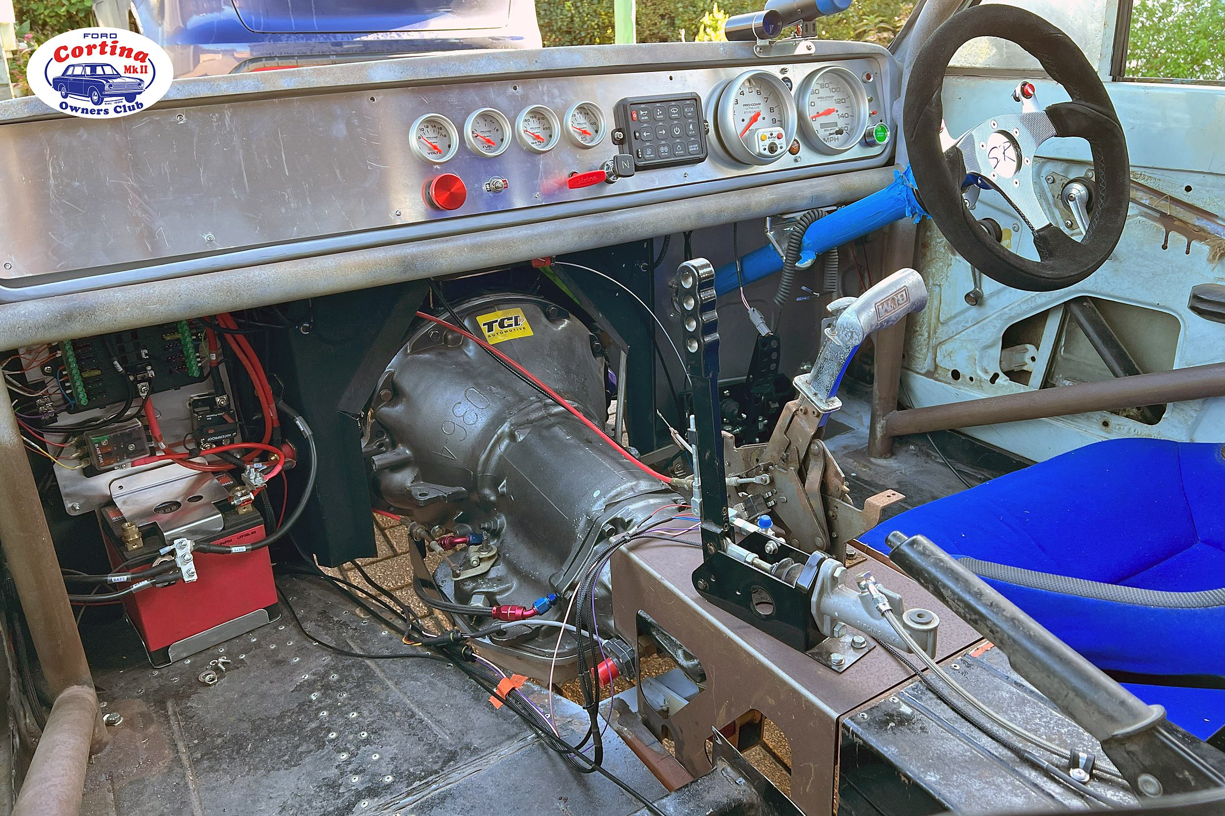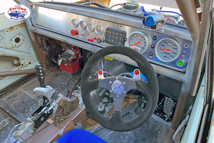 The brakes benefit from a floor mounted bias pedal box with two Wilwood brake master cylinders (front & rear) with an electric line lock on the front circuit. A fly off hydraulic handbrake has been fitted but the standard handbrake remains for MOT purposes as the Cortina will be road legal. The wheels are VMS Racing rims, 3.5”x15” up front, 10”x15” to the rear.