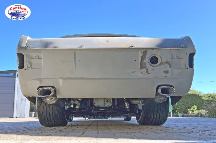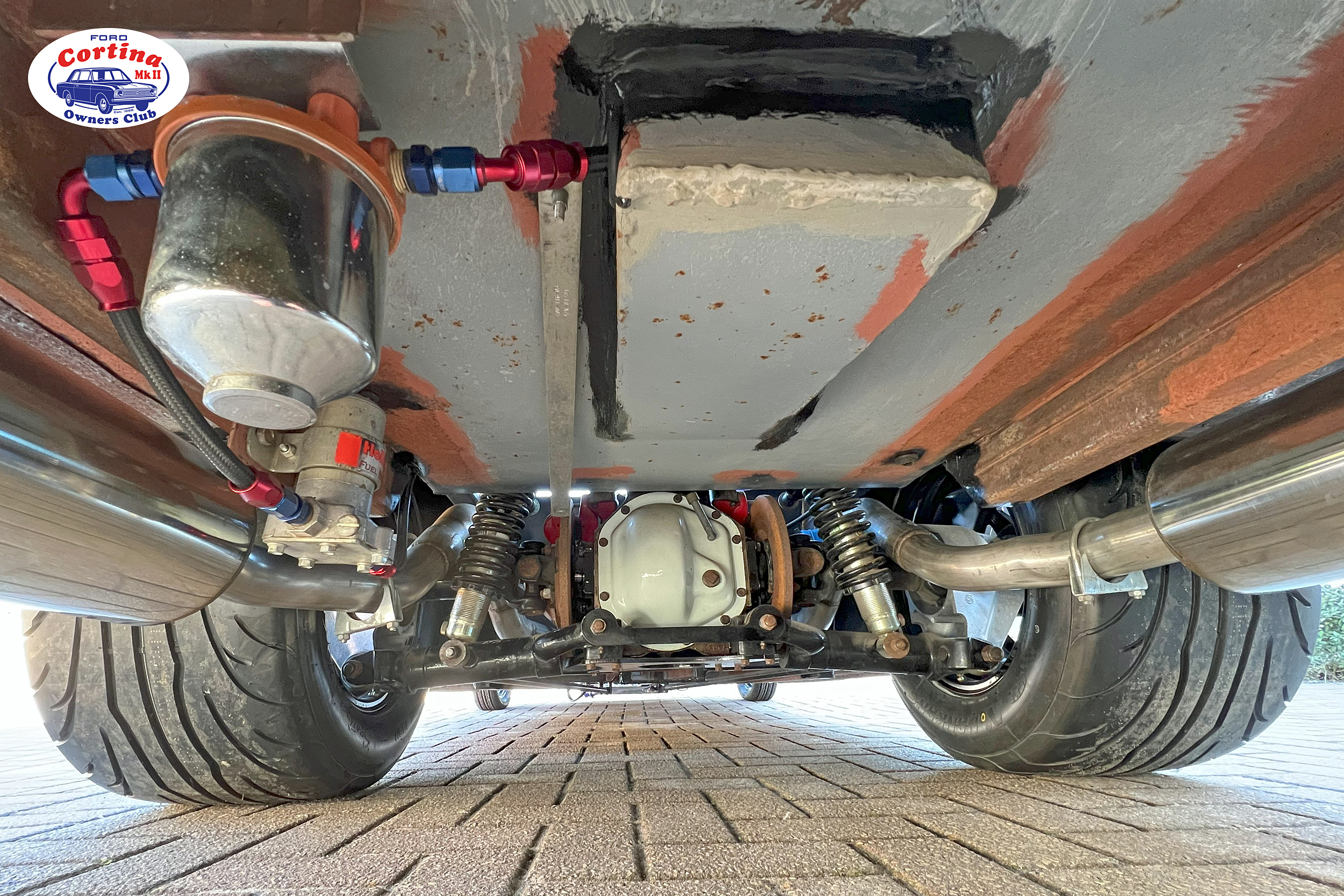 Fitting a small block V8 into the engine bay of a MkII Cortina is not an easy task and involves a lot of cutting. The slam panel, front valence and crossmember were the first to go and the bulkhead soon followed. Almost before he knew it, Thierry had the floors and inner wings removed too. A custom space frame chassis with an integrated 8 point roll cage was then built to fit under what was left of the bodyshell. The front clip comes from a Mk4/5 Cortina that has been modified to take custom coilover dampers from GAZ and has Hi-Spec billet 4 pot callipers with 255mm vented disks and alloy hubs fitted. At the rear you’ll find a Jaguar IRS axle fitted with a Powerlok LSD. The inboard brake disks were kept but has heavy duty halfshafts with the whole lot shortened by 6.5” to keep everything sitting under the original MkII Cortina wheel arches. GAZ also takes care of the rear damping with custom made coilovers again.